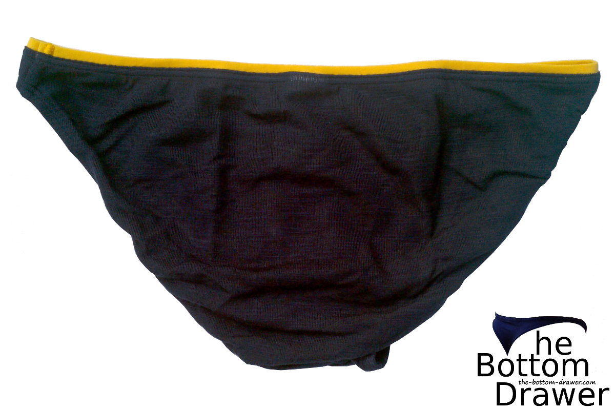The contoured pouch does have a center seam, but it is done with what I call a flat seam. It is pretty supportive though the fabric does have some give to it. Probably not one I’d choose for a lot of active exercise that involves running. Would be fine for activities like hiking. The back of the bikini brief, I’m going to call a generous three quarter back. The sides measure about one inch, which is a perfect width in my opinion. These are to be hand wash and hung to dry. They are made in Mexico.
