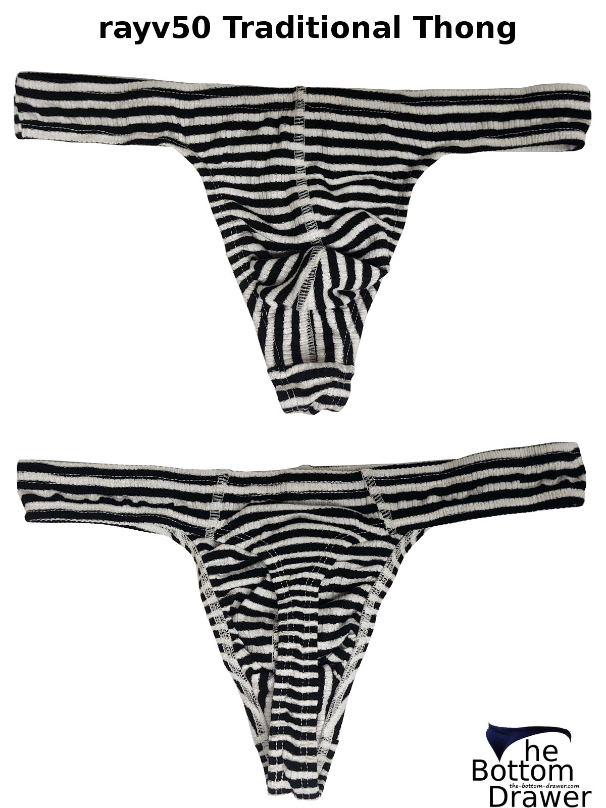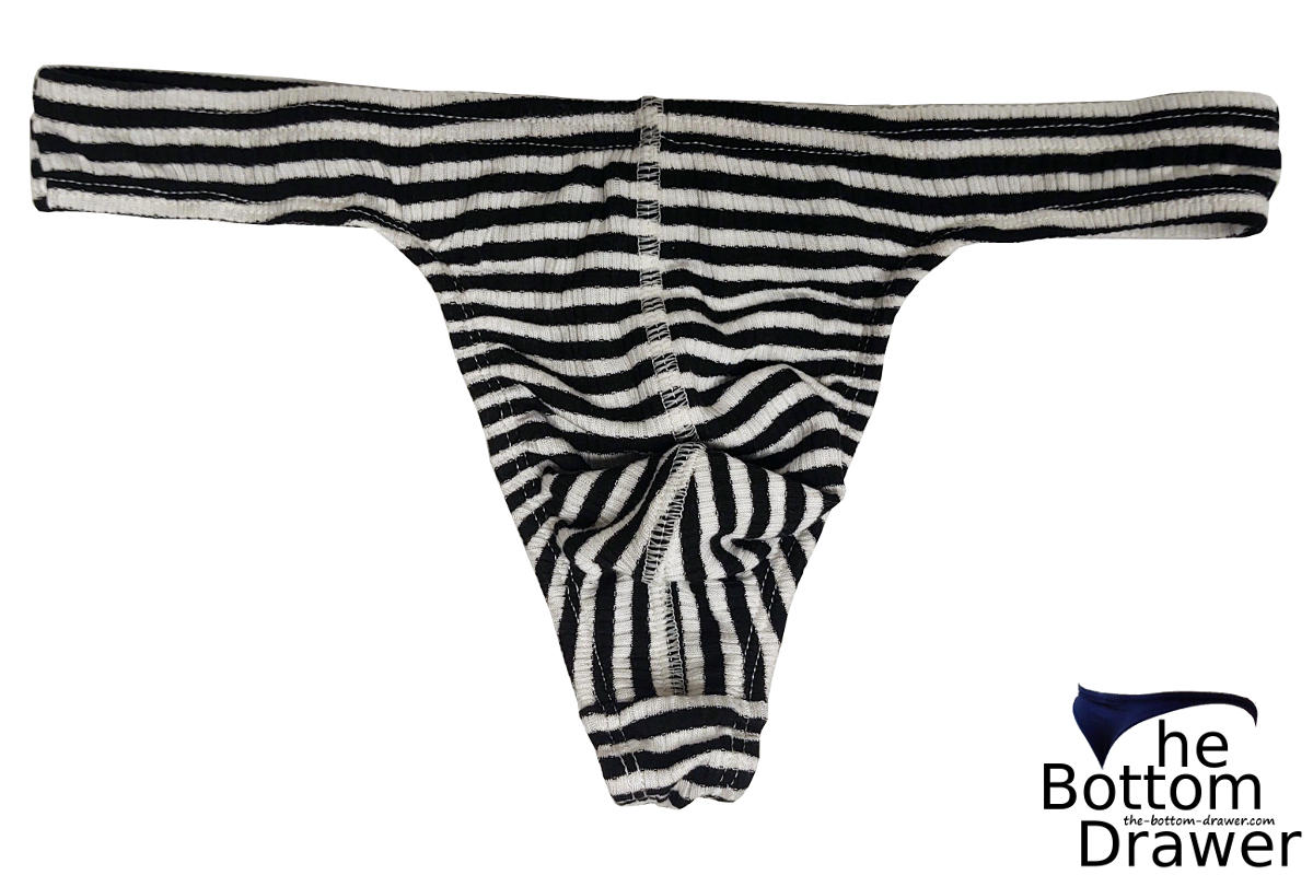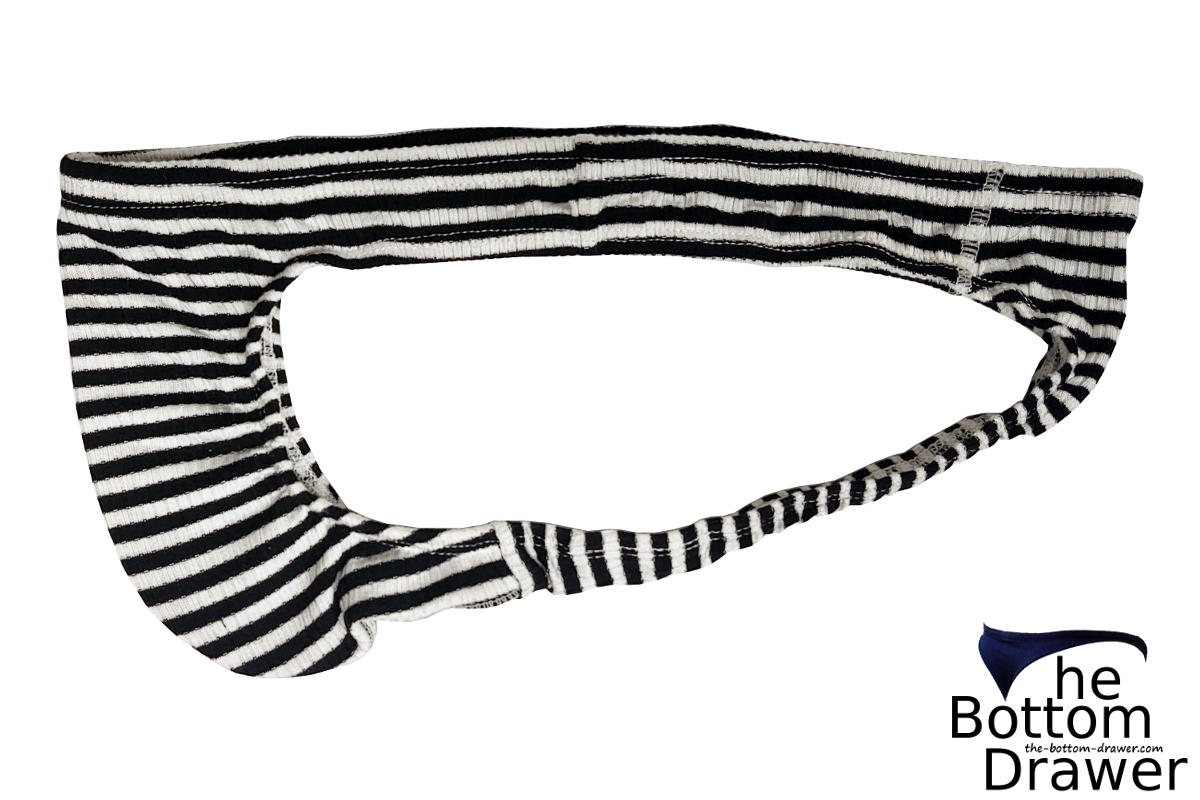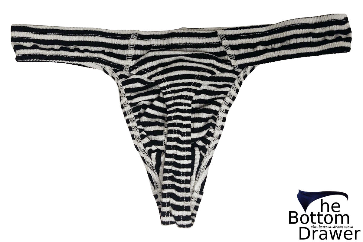 Some thongs can stand out in a picture, but even a special appearance by the blog’s hot inhouse model would struggle to raise this one above the mundane. The black and white stripes also remind me of the clothing that convicts wore back in the day.